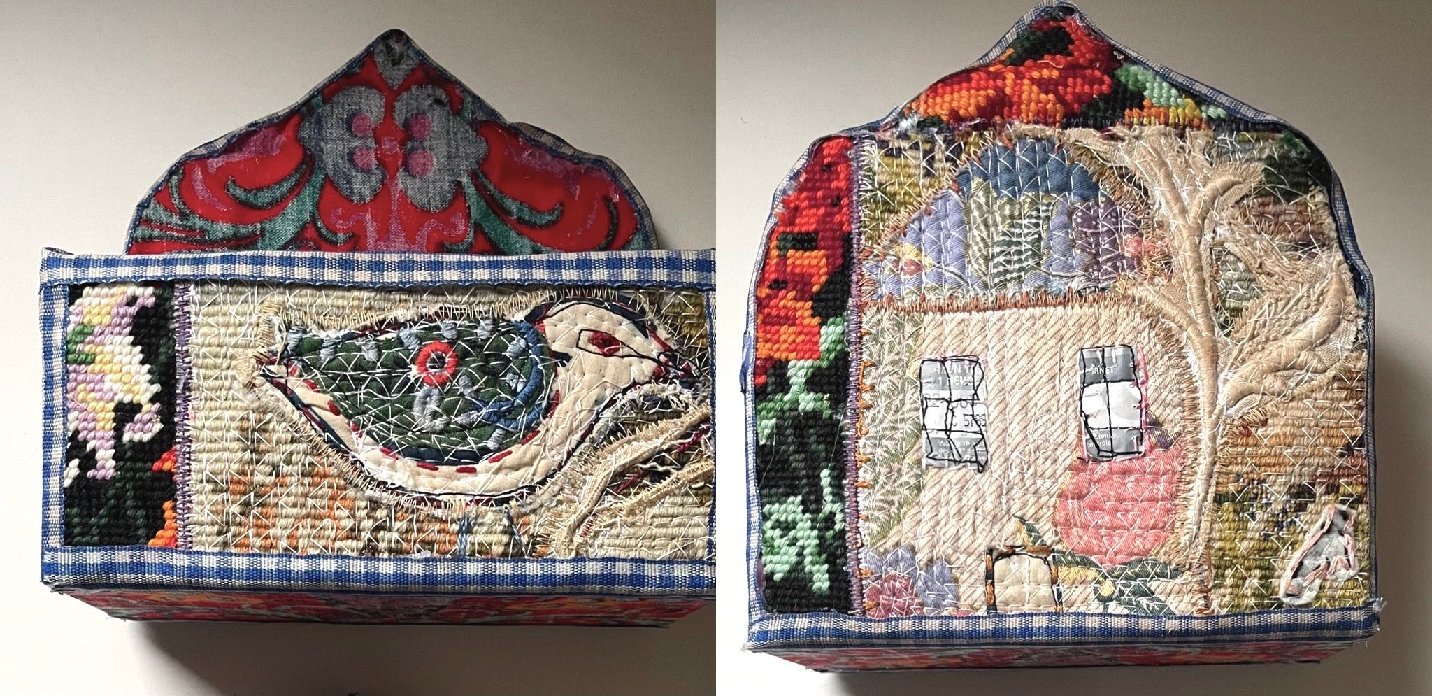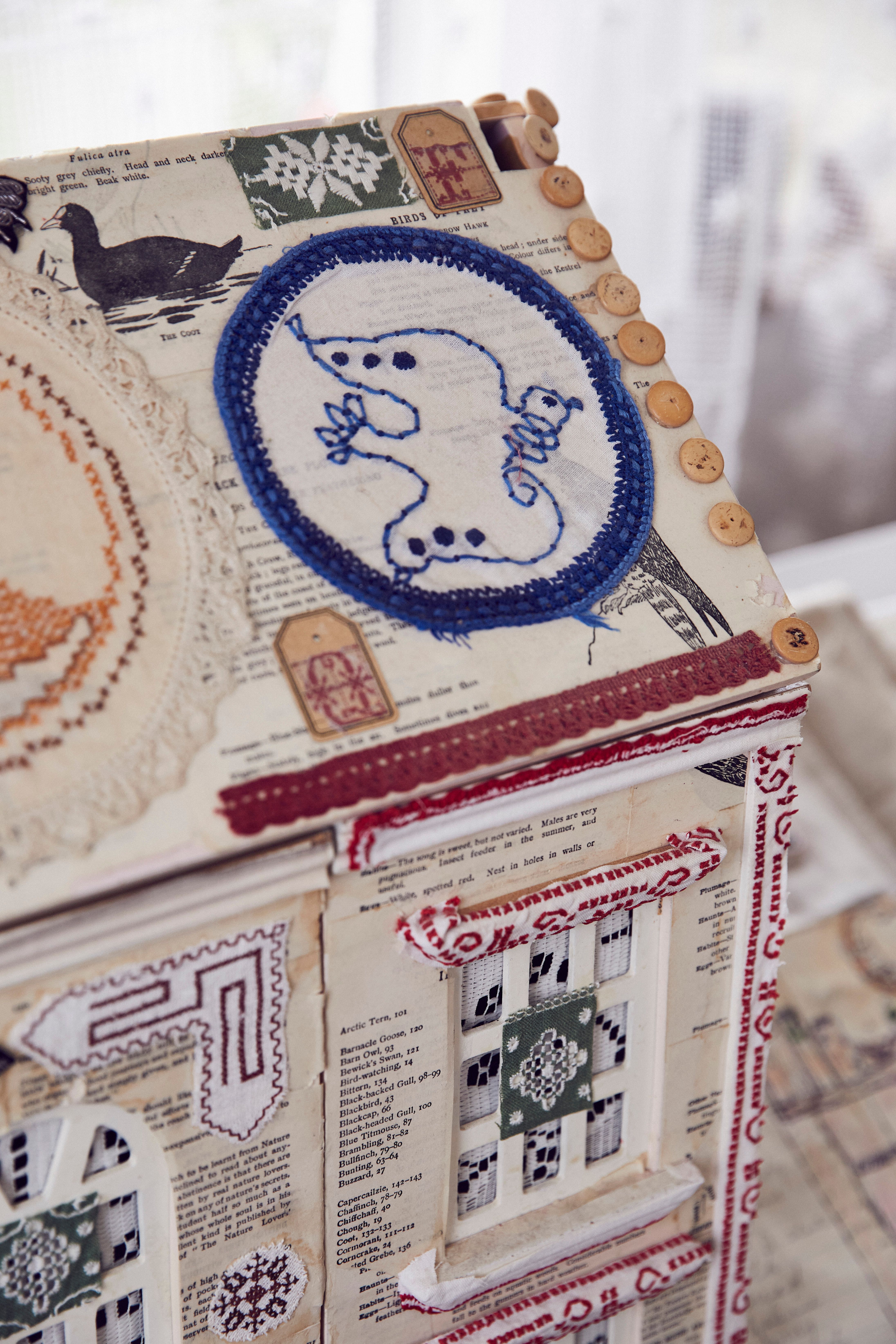 UK based textile artist Anne Kelly is an award-winning artist, author and tutor. Her multi-layered and densely stitched textiles have been described as ‘small worlds’. Trained in Canada and at Goldsmiths College in London, she creates wall hangings and objects using a mixture of mixed media collage and hand and machine embroidery. Her inspirations are taken from travel, memory, nature and especially folk art.