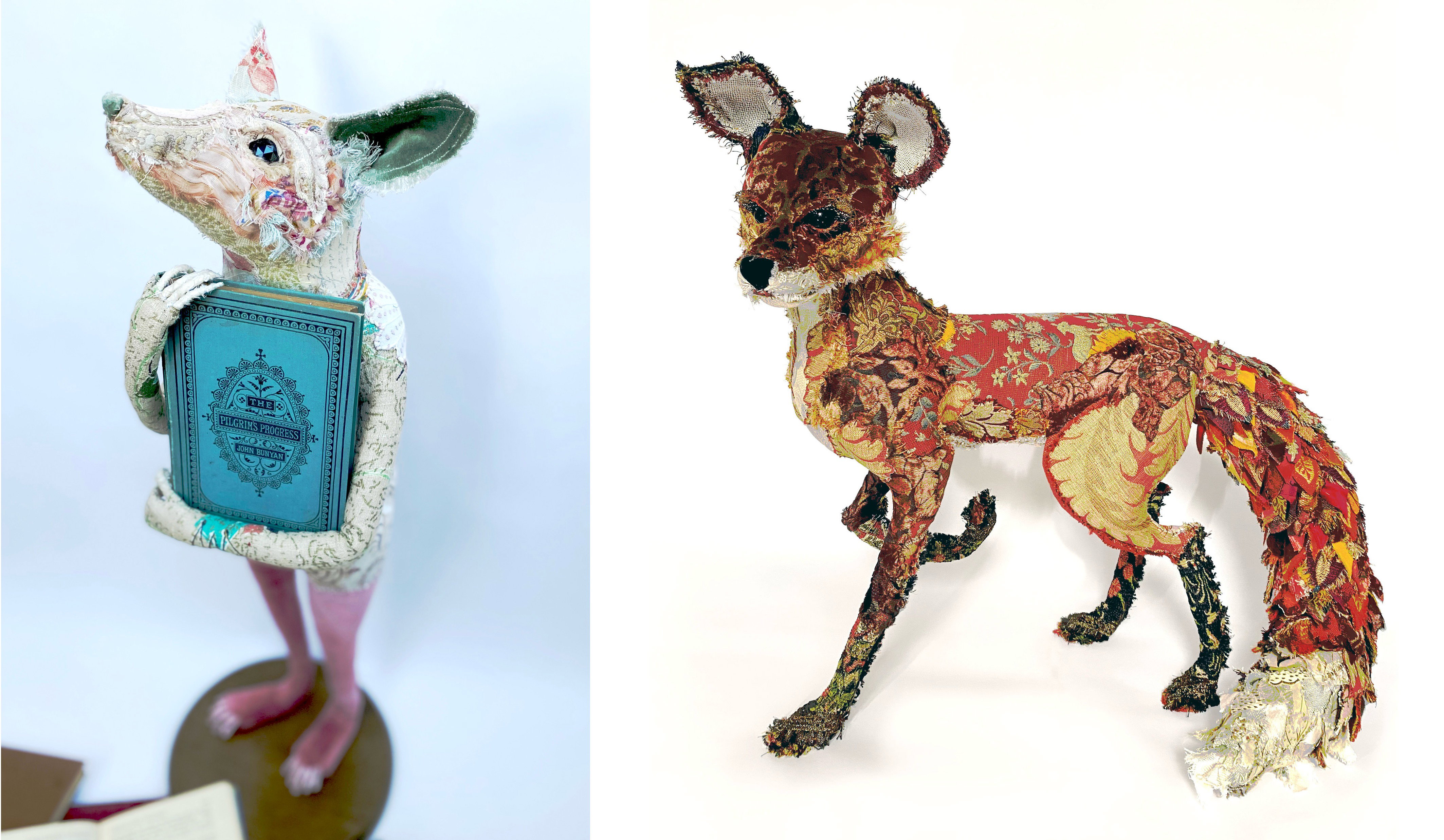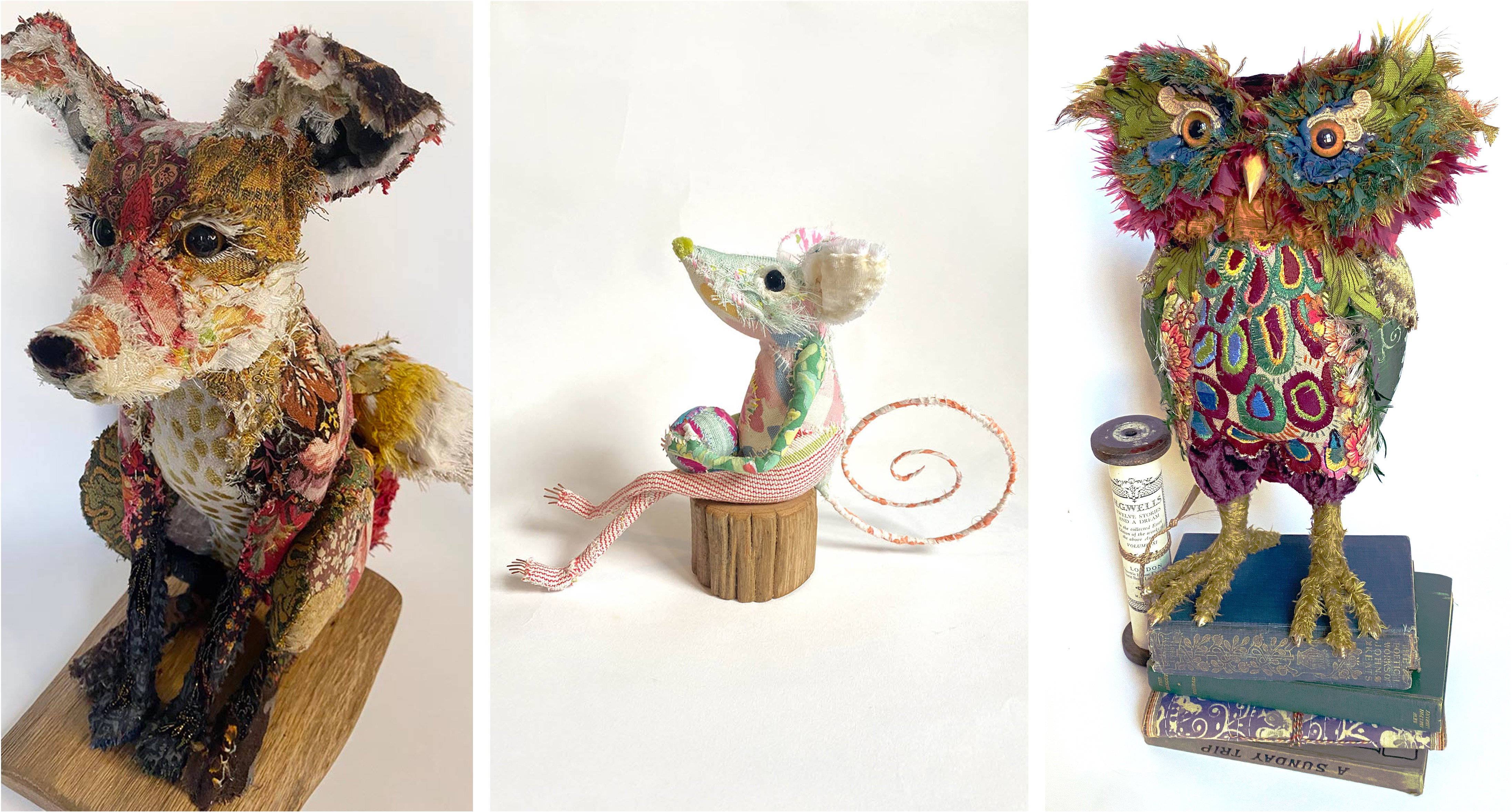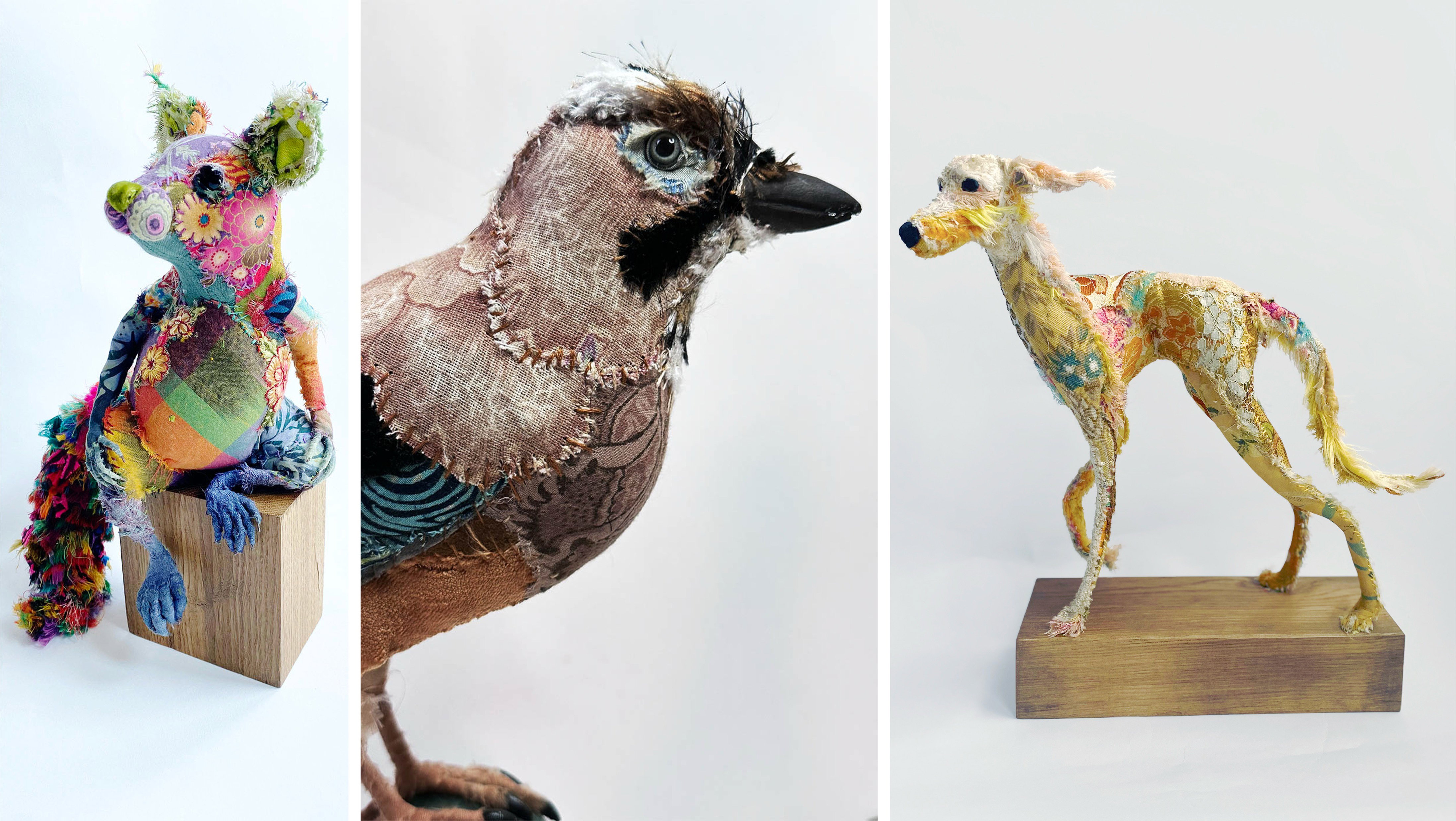 I am a textile sculptor working with reclaimed and repurposed fabrics and haberdashery to create characterful, animal-inspired creatures. My work is shaped by an enduring awe for the natural world and our place within it, and by the long, storied relationship between humans and animals. Drawing on animal folklore, anthropomorphism and narrative, I prioritise personality and presence over realism, allowing each sculpture to develop its own distinct character.